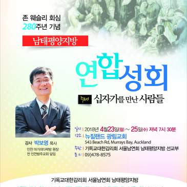 존 웨슬리 회심 280주년 기념 남태평양지방 연합성회가 ‘십자가를 만난 사람들’ 이라는 주제로 4월 23일(월)~25일(수)까지 매일 저녁 7시 30분에 뉴질랜드 광림교회에서 있습니다. 강사로는 전 인천방주교회 담임목사이신 박보영 목사님을 모십니다.